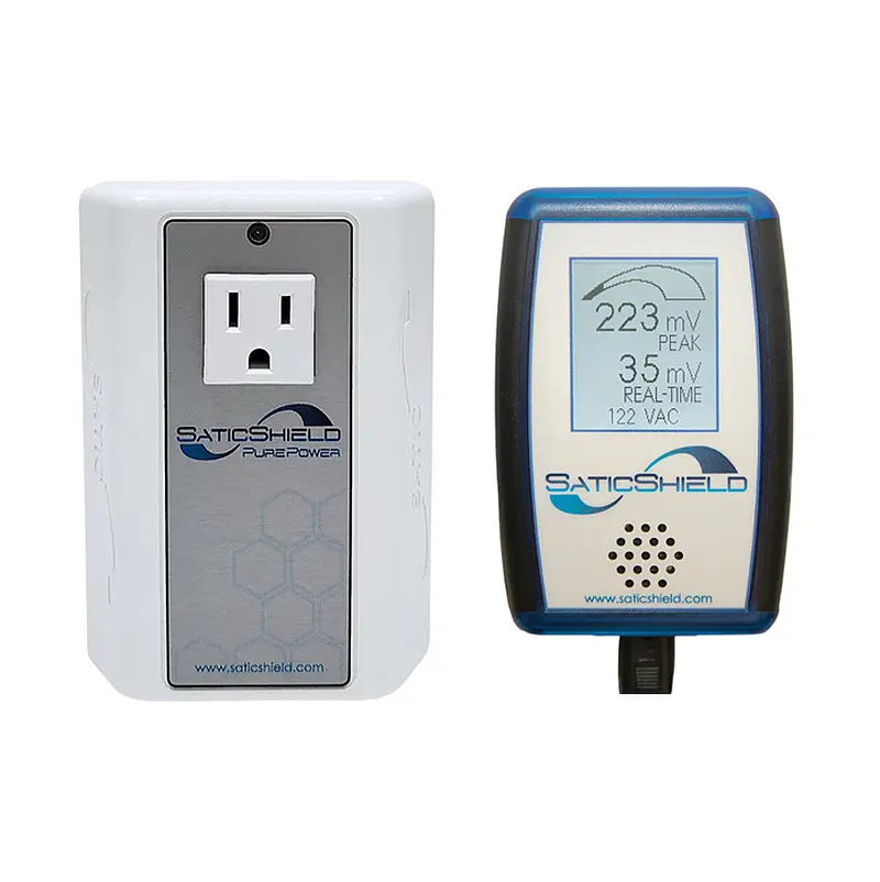 Package Deal. Wonderful for testing dirty electricity. One Satic Pure Power plug-in dirty electricity filter, one Satic Dirty Electricity (Line EMI) Meter, and one clipboard. If you’d like to mitigate both phases of electricity in your home, then I suggest the two-pack Pure Power plug-in plus Dirty Electricity Meter.